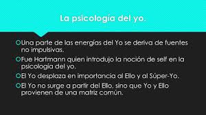 Después de Freud, el psicoanalista más responsable por el desarrollo de la psicología del yo es Heinz Hartmann (Hartmann, 1958). A través de su asiduo estudio de funciones del yo y de cómo un individuo se adapta a su entorno, Hartmann creó tanto una psicología general como un instrumento clínico con la cual un analista podía evaluar el funcionamiento de un individuo y formular intervenciones terapéuticas.